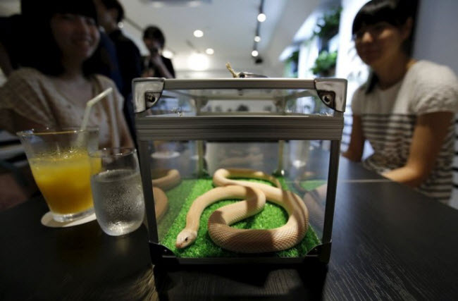 Du khách có cơ hội chơi đùa với những con răn khi thưởng thức đồ uống tại một quán cà phê độc đáo ở Tokyo, Nhật Bản.