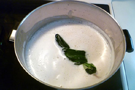 - Bước 4: Tiếp tục cho nước đậu vừa vắt được vào nồi, đun sôi cùng với vài lá dứa để dậy mùi thơm. Khi đã sôi, bạn để lửa riu riu nhỏ vài phút rồi tắt bếp.