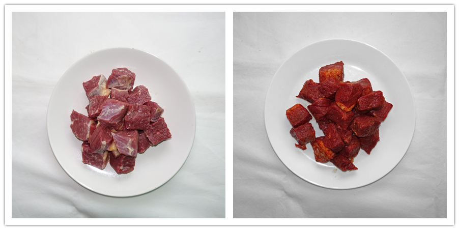 Cà rốt, khoai tây, hành tây cắt miếng to, cà chua chia bốn. Dùng nước nóng tráng qua rồi nhanh tay thả vào nước lạnh, như vậy sẽ dễ bóc vỏ. Lấy 1 chảo dầu khác, đổ dầu và thả hành tây vào đảo thơm, rồi cho cà rốt và khoai tây vào xào đến khi chuyển màu th́ cho tiếp cà chua vào đảo thành một hỗn hợp sệt thơm ngây ngất.