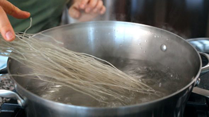 1. Nấu một nồi nước sôi, cho miến vào. Nấu trong khoảng vài phút, tới khi miến chín. Ăn thử vài cọng. Phải bảo đảm miến thật mềm khi nhai. Trút miến ra rổ.