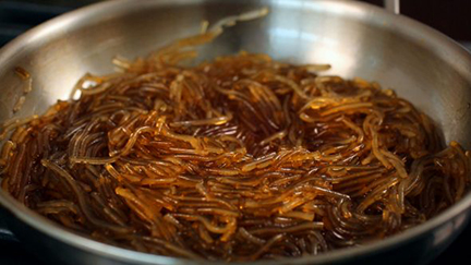 4. Đặt một nồi không lên bếp lửa, cho vào một muỗng dầu ăn. Cho miến vào, khuấy đều cho tới khi miến khô. Bấy giờ mới thêm nước tương, đường và tiêu tột vào. Tiếp tục trộn cho tới khi cọng miến nhìn trong veo và bóng mượt. Thêm dầu mè vào, sau đó trút ra tô lớn.