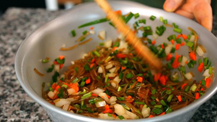 5. Thêm cà rốt, hành, hẹ vào, trộn đều trong tô miến.