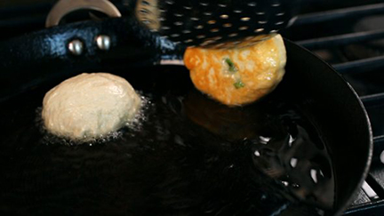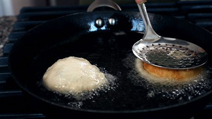 5. Thả cục bánh vào chảo dầu nóng. Khi mặt dưới vàng, lật ngược chiếc bánh. Dùng chiếc xẻng kim loại để ép dẹp chiếc bánh rán. Xem hình.
