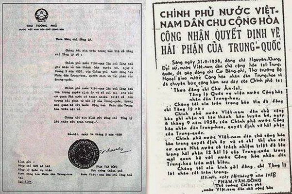 Ngày 14 tháng 9 năm 1958, Phạm Văn Đồng, Thủ tướng CSVN, gởi cho Thủ tướng Trung Cộng Chu Ân Lai một công hàm “ghi nhận và tán thành bản tuyên bố, ngày 4 tháng 9 năm 1958, của Chính phủ nước Cộng Hoà Nhân dân Trung-hoa, quyết định về hải phận của Trung-quốc.”