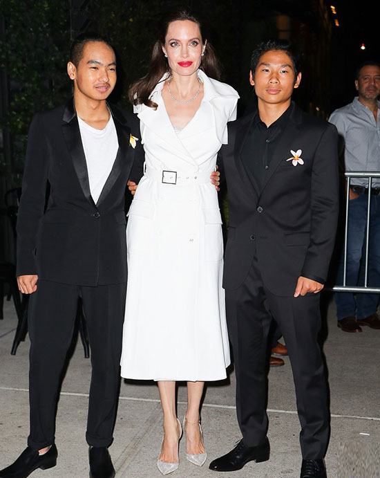 Jolie diện váy thanh lịch đi dự tiệc cùng hai con trai, Maddox và Pax Thien (phải), tối 14/9.