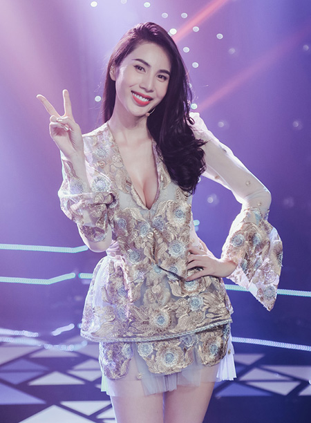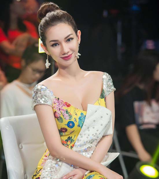 Diện trong chiếc váy thiết kế họa tiết hoa vàng thiết kế cách điệu. Quỳnh Chi trông sexy và hở bạo khi khoe ngực đầy khi ngồi chấm thi tại một gameshow