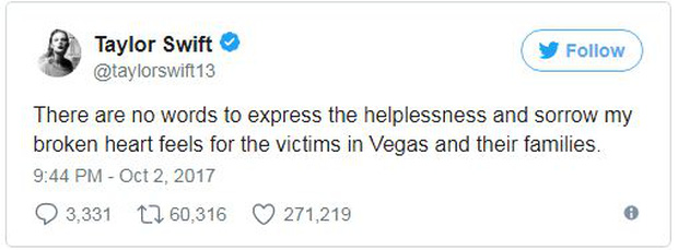 Taylor Swift là 1 trong số ít các ca sĩ đã sớm gửi lời chia buồn tới toàn thể các nạn nhân và gia đình họ trong cuộc thảm sát bằng súng ở Las vegas. Không chỉ vậy cô còn được 1 cảnh sát cũng là nạn nhân trong vụ này có lời ca ngọi hết lời trên mạng xã hội. Đây quả thực là 1 vụ thảm sát sẽ còn ám ảnh người Mỹ rất lâu nữa.