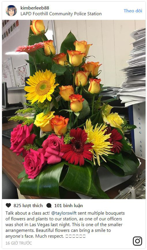 Kimberlee Binder - một nhân viên phân tích dữ liệu của Sở cảnh sát Los Angeles - đã đăng ảnh chụp những bông hoa trên Instagram kèm lời nhắn: "Quả là một nghĩa cử đẹp! @Taylorswift đã gửi nhiều bó hoa và cây xanh đến đồn cảnh sát chúng tôi, vì một sĩ quan của chúng tôi bị bắn ở Las Vegas đêm qua.