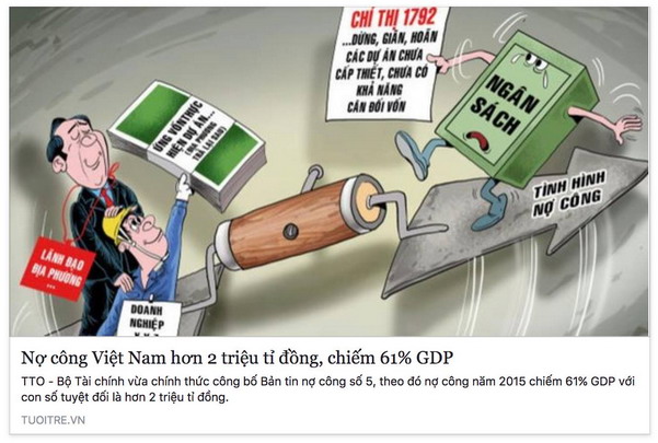 6.Cụ thể, theo Bản tin nợ công, tính đến cuối năm 2015 dư nợ của Chính phủ là hơn 94 tỉ USD, tương đương hơn 2 triệu tỉ đồng, trong đó nợ nước ngoài là 39,6 tỉ USD, nợ trong nước là hơn 54 tỉ USD. Năm 2015, nợ trong nước là 54 tỉ USD trong khi đó năm 2011 vay trong nước dừng lại ở con số 20 tỉ USD. Nợ công Việt Nam hơn 2 triệu tỉ đồng, chiếm 61% GDP - Ảnh