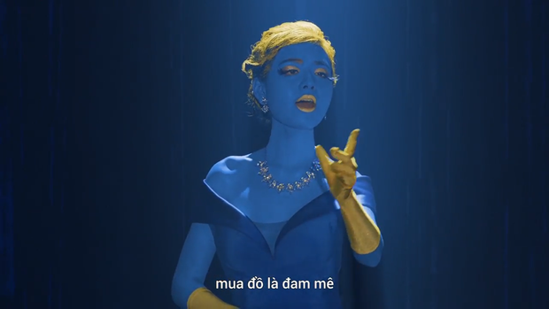 Chưa kịp giật mình vì mỹ nhân màu xanh kỳ quặc này thì khán giả đã được phen cười bò khi bài hát chủ đề vang lên. "Phận là phụ nữ, mua đồ là đam mê. Quạt, nồi, bếp gas, bình, tách, ly... muốn mua 'quài quài'..." - Trên nền beat của ca khúc "Duyên phận", mỹ nhân màu xanh đã hát lên tâm tình của biết bao chị em khớp một cách xuất sắc!