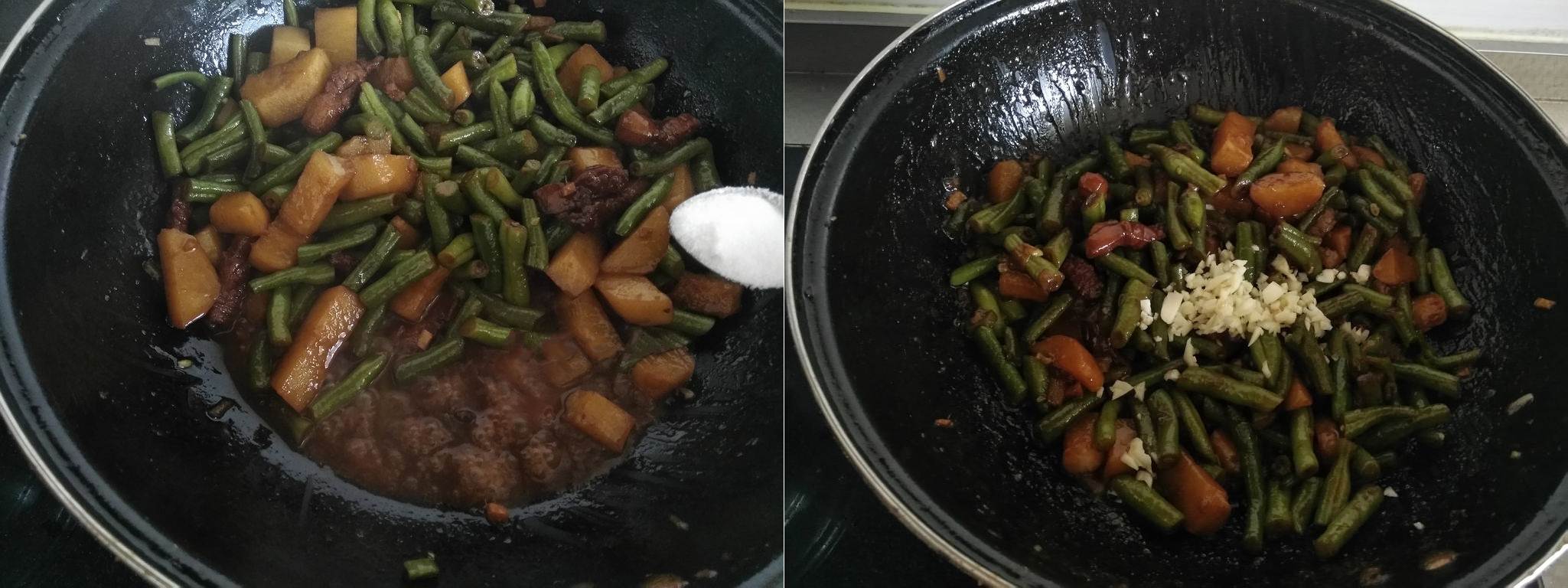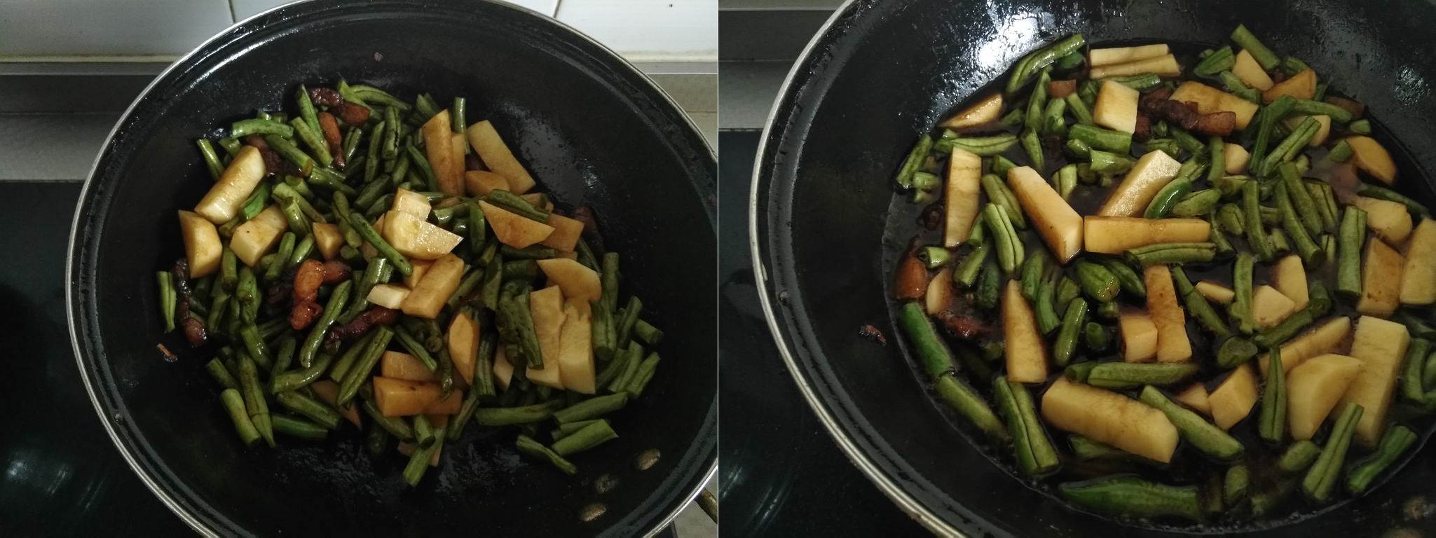 Đậu đũa cắt khúc, khoai tây cắt dạng con chì, gốc hành thái nhỏ, gừng băm nhỏ. Cho một ít dầu ăn vào chảo, thêm thịt cùng rượu nấu ăn và gừng vào đảo chung.