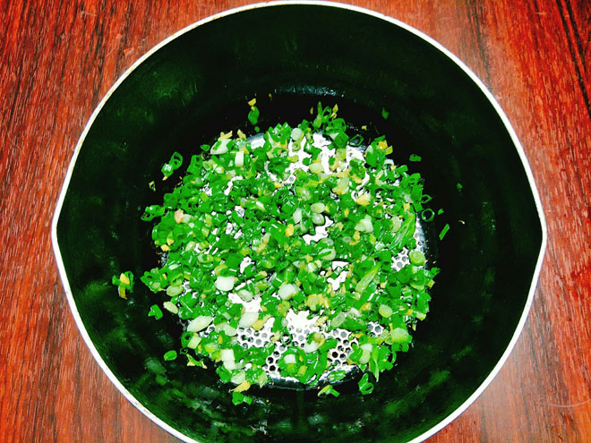 - Bước 4: Cho mỡ gà vào nồi đun cho mỡ nóng già sau đó cho hành lá, gừng băm nhỏ vào xào khoảng 1 phút cho thơm lên là tắt bếp, chắt lấy phần nước gà tiết ra trong quá trình hấp cho vào cùng mỡ hành và trộn đều.