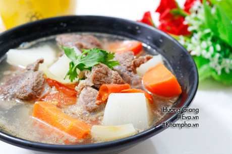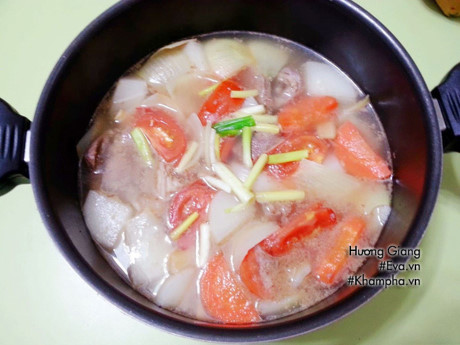 Bước 3: Khi thịt bò gần mềm, cho củ cải, cà rốt vào nấu cho đến khi chín mới cho tiếp hành tây, cà chua vào nấu thêm 5 phút. Nêm lại gia vị cho vừa ăn rồi tắt bếp, cho hành lá, rau mùi vào.