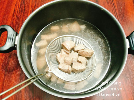 - Bước 1: Thịt bò rửa sạch sẽ, thái miếng to sau đó đun 1 nồi nước sôi thì cho thịt bò vào chần sơ qua, vớt ra rửa lại cho sạch.