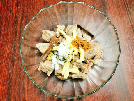- Bước 2: Cho thịt bò vào tô, thêm nước mắm, muối, tiêu, gừng cạo vỏ đập dập, 1 chút tỏi băm, ngũ vị hương, đường, rượu vang, quế sau đó trộn đều và ướp thịt 40 phút cho ngấm gia vị.