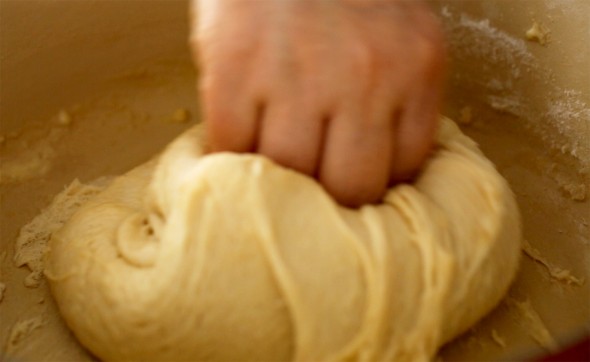 7. Mở nắp ra. Nhồi bột thật mịn màng cho tới khi cục bột trở thành một quả banh tròn và nhẵn thín.