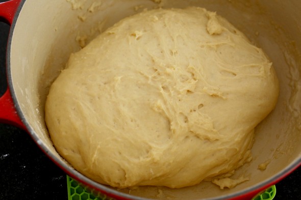 4. Mở nắp. Cho một chén rưỡi bột vào nồi gang. Sử dụng muỗng gỗ (hoặc muỗng xới cơm) trộn bột với hỗn hợp sữa + bơ + đường. Trộn không ngừng tay trong vòng một phút. Trộn cho tới khi bột bắt đầu dính và nặng tay.