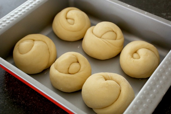 10. Lập lại hành động trên với 5 cục bột còn lại. (Xem hình) Nhớ chừa khoảng cách giữa những chiếc bánh mì, vì bột sẽ tiếp tục nở ngay trên khay nướng bánh.