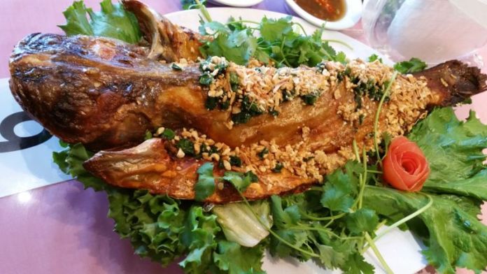Món ăn cá nướng da giòn ở “Hương Đồng Cỏ Nội”. (Hình: Ngọc Lan/Người Việt)