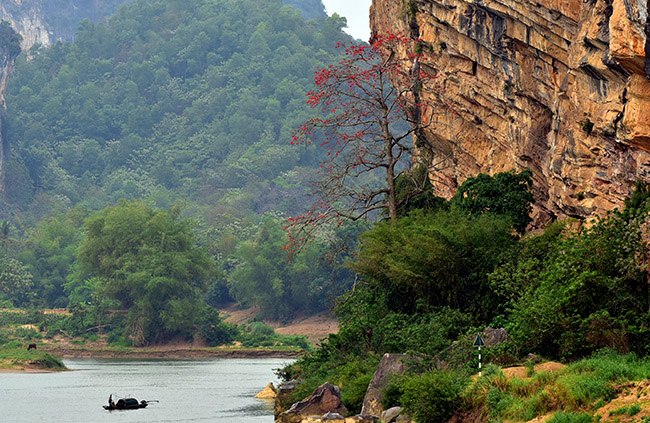 Cây gạo đỏ rực bên những ngọn núi cao sừng sững ở huyện Quản Bạ (Hà Giang). Vào đầu tháng 4, đi dọc quốc lộ 4B qua các huyện Yên Minh, Quản Bạ, Đồng Văn... hình ảnh hoa gạo nở bên lưng chừng núi đá xuất hiện rất nhiều.