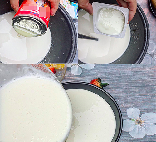 - Cho 2 hộp sữa chua vào nồi sữa khuấy đều rồi đổ hỗn hợp trên vào nồi cơm điện (chỉ cần để vào nồi cơm điện rồi đóng nắp, không cắm điện).