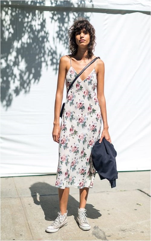 Nếu bạn không muốn khoe thân quá nhiều có thể chọn mix váy hai dây cùng áo thun và đừng quên sneaker để hoàn thiện phong cách, bắt kịp xu hướng hè năm nay.