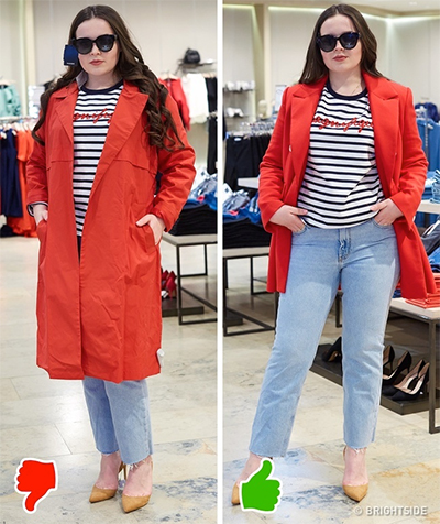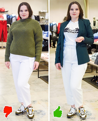 Nhiều phụ nữ quá cân nghĩ rằng quần áo rộng sẽ giúp che đi vòng eo, bắp chân to. Nhưng đây là một quan điểm hoàn toàn sai vì trang phục như vậy sẽ tạo cảm giác thân hình bạn nở nang hơn. Do vậy, bạn nên chọn áo khoác ngắn thay cho chiếc măng tô quá dài, rộng. Ngoài ra, bạn cũng đừng ngại lựa chọn màu sáng, chỉ cần quan tâm việc kết hợp màu sắc phù hợp nhất với vẻ ngoài của bạn.