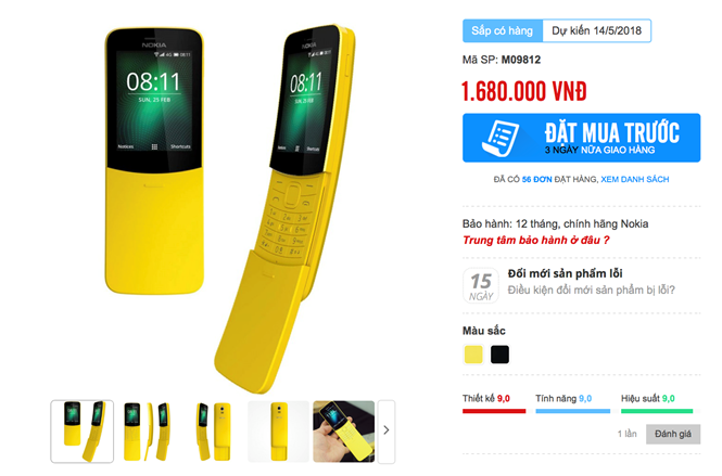 Một phiên bản có từ năm 1996 sẽ chính thức được Nokia hồi sinh đó chính là Nokia 8110. Theo đó Nokia 8110 sẽ chính thức được bán ở Vn với giá chỉ 1,68 triệu đồng. Được biết dòng máy này đã được hãng nâng cấp lên rất nhiều với các tính năng thời thượng. Thông tin từ một số nhà bán lẻ di động tại Việt Nam cho biết Nokia 8110 chính hãng sẽ lên kệ từ ngày 14.5 tới, giá bán tham khảo 1,68 triệu đồng. Trong đợt mở bán đầu tiên, máy chỉ có lựa chọn màu đen. Phiên bản màu vàng hiện vẫn chưa rõ thời gian lên kệ.