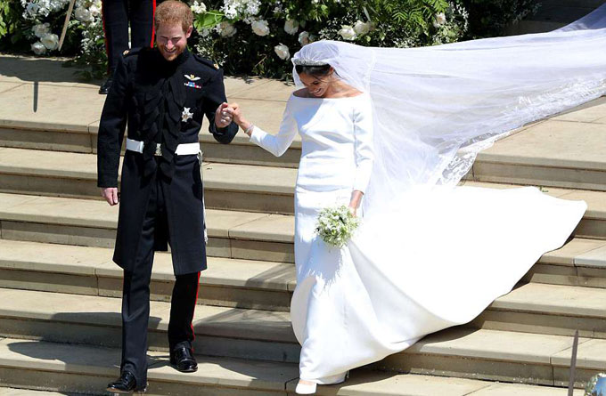 Không chỉ vậy, khi xuất hiện cùng chồng trong bộ váy cưới thứ hai dạng yếm lụa dáng dài, nữ công tước xứ Sussex đă chào báo giới với một chiếc nhẫn lấp lánh ánh xanh.