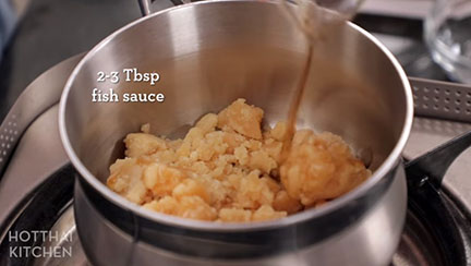 Trộn chung hỗn hợp đường cọ, 2 muỗng canh nước mắm, bột tôm và nước trong một nồi nhỏ. Nấu trên lửa vừa và nhỏ cho đến khi đường được hòa tan.