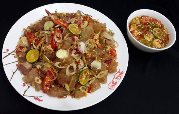 Gân bò ngâm kiểu Thái chấm cùng nước chấm chua chua, cay cay.