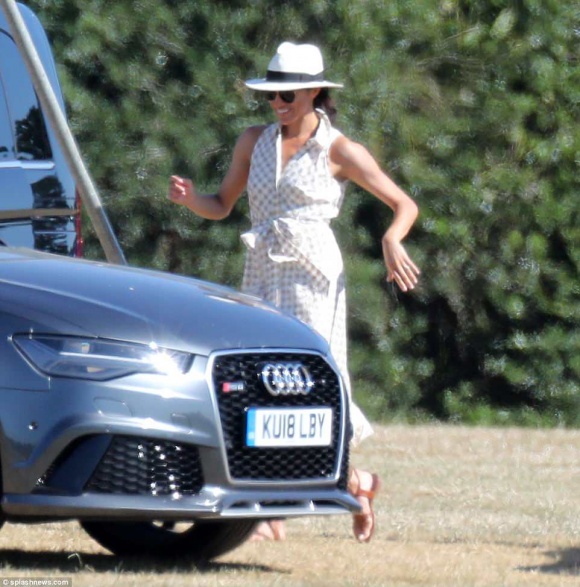 Trước đó, Công nương Meghan cũng gây chú khi tới tới cổ vũ cho Hoàng tử Harry và Hoàng tử William khi họ thi đấu polo. Vợ Hoàng tử Harry diện váy sơ mi có điểm nhấn ở phần eo kết hợp với sandal cột dây cổ chân và mũ đội đầu thời trang. Được biết chiếc váy mà Công nương Meghan mặc có giá 395 USD (khoảng 9 triệu đồng). Trong khi đó đôi sandal cô đi có giá 245 USD (khoảng 5,6 triệu đồng). Bên cạnh đó, vì trời khá nắng nên cô còn sử dụng thêm phụ kiện kính râm.