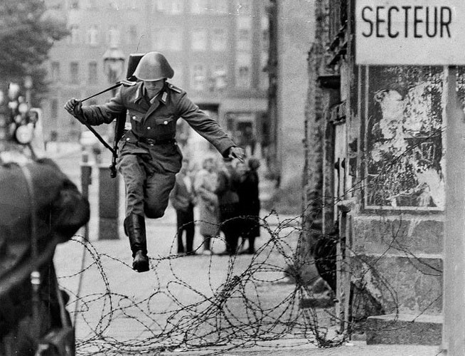 “Bước nhảy vào tự do”: Bức ảnh nổi tiếng của nhiếp ảnh gia Peter Leibing, ghi lại khoảnh khắc người lính Đông Đức 19 tuổi Conrad Schumann vượt qua hàng rào thép gai tại phố Bernauer nhảy sang phía Tây Đức. Nơi có hàng rào thép gai sau này được xây thành Bức tường Berlin lịch sử.