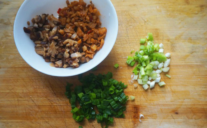 Nấm và củ cải khô cũng cắt thành miếng hạt lựu, hành lá thì cắt nhỏ.
