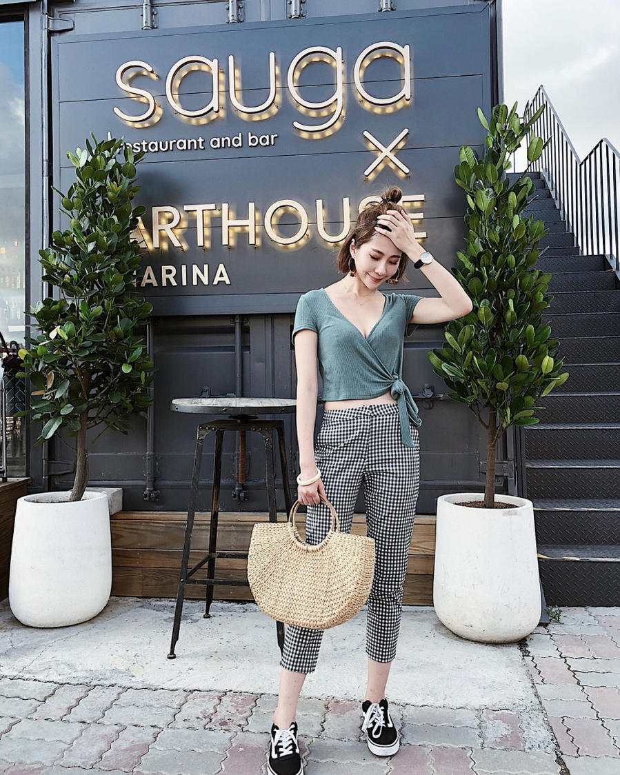 Điểm sáng nhất của chiếc quần này chính là phần eo được nhấn nhá bởi các chi tiết như: nơ buộc hay thắt lưng, vừa khiến set đồ thêm nổi bật lại đánh lừa thị giác để không ai nhận ra vòng bụng có phần đẫy đà của các nàng.