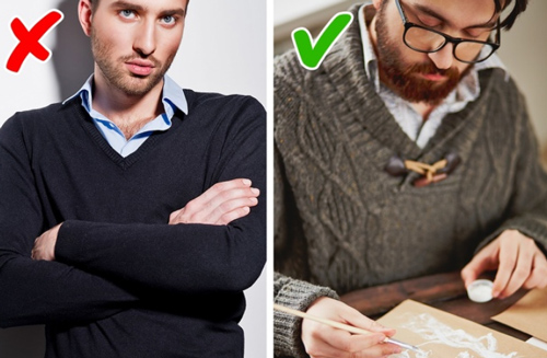 Kết hợp áo sơ mi bên trong áo len là cách mặc quen thuộc của nhiều đàn ông. Cách này không có vấn đề gì, trừ việc hãy chọn một chiếc áo len dày dặn một chút. Vì chất liệu len mỏng sẽ làm nổi bật các nếp gấp, tất cả các đường may, túi áo và cúc của áo sơ mi. Điều đó khiến chiếc áo len bên ngoài nhìn có vẻ nhăn nhúm như một chiếc áo cũ.