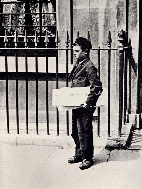Cậu bé bán báo giấy đang tìm kiếm khách hàng. Thời kỳ này, báo in vẫn là phương tiện người dân sử dụng thường xuyên nhất để cập nhật thông tin mỗi ngày nên đông đảo trẻ em hành nghề bán báo trên phố