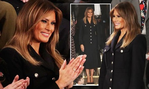 Đệ nhất phu nhân Mỹ Melania Trump mặc áo gần 2.000 USD tới nghe Thông điệp liên bang. Bà luôn biết chọn trang phục để bản thân nổi bật mỗi khi xuất hiện. Bà Trump tay chỉ đeo một chiếc găng tay trong chiếc áo khoác dài màu xanh đen.