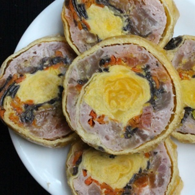 - Xếp 3 lòng đỏ trứng lên bề mặt thịt.