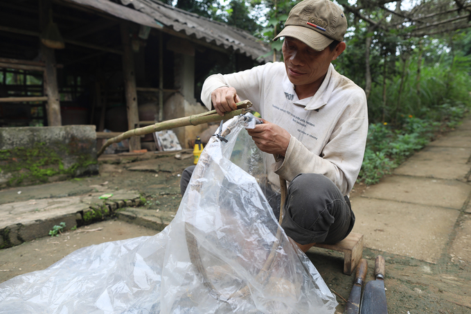 Ông Chương Văn Nghị ở xã Minh Tiến (huyện Ngọc Lặc, Thanh Hoá) theo nghề bắt bọ xít hơn 10 năm. Hàng ngày, ông dùng sào tre và túi ni lông đi bắt bọ xít giúp các hộ dân trong xã.