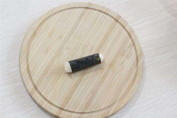 Cắt rong biển thành những miếng kích cỡ 3x5 cm. Trải miếng rong ra biển ra, bóp nhân thịt gà lên trên rồi nhẹ nhàng cuốn tròn lá rong biển quanh nhân. Làm tương tự với những miếng còn lại đến khi hết nguyên liệu.