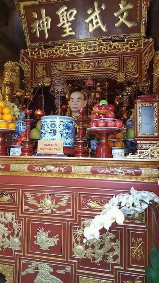 Em thấy có một bàn thờ, có để tên là đức thánh trần trên bàn thờ có đặt bảng tên như mấy cái để trên bàn của mấy ông công an. Trên bàn thờ có hình một ông bị hói đầu, da mặt thì trắng hồng, còn môi thì đỏ như son như mấy chị ở gần nhà em. Em hỏi chị em ổng là ai, chị nói là ông trần đại quang, ổng giỏi lắm nhưng chết queo rồi vì cái gì… vi-rúc lạ. Em không biết “rúc lạ” là cái gì, để mai đi học em hỏi thằng beo, thằng đó cái gì nó cũng biết.
