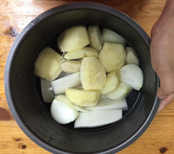 - Để nấu nước dùng lẩu thì đơn giản vô cùng. Những lúc có khách đến bất chợt, tôi xào ít hành tây, đổ nước vào ninh cùng mấy trái táo đỏ, thả củ su hào hoặc củ cải rồi chần thịt dần là được nồi nước ngon rồi.