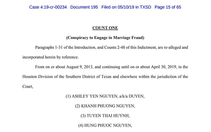Tài liệu của công tố cho biết có ít nhất 47 cuộc hôn nhân, từ tháng 9/2013 đến tháng 4/2019, đã được sắp đặt để người hôn phối nước ngoài có thể hưởng lợi khi nộp hồ sơ lên USCIS.