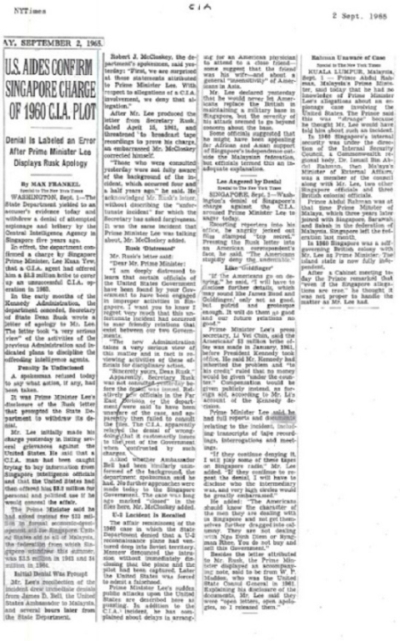 Bài báo liên quan đến việc CIA phủ nhận việc hối lộ ông Lý Quang Diệu đăng trên New York Times ngày 2/9/1960.