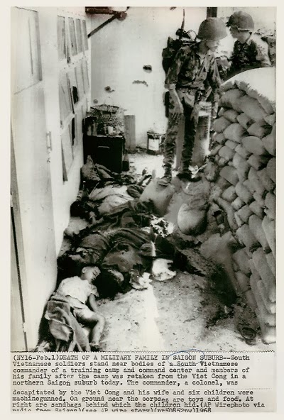 Tấm hình chụp ngày 1 Tháng Hai, 1968, của hãng AP, với lời chú thích: “Quân nhân thuộc Quân Lực Việt Nam Cộng Hòa đứng bên các thi hài một cấp chỉ huy một trung tâm huấn luyện của quân đội miền Nam và gia đình ông sau khi quân đội miền Nam tái chiếm trung tâm từ tay Việt Cộng. Người chỉ huy, cấp tá, bị chặt đầu; vợ và sáu người con của ông bị bắn chết bằng súng máy. Vương vãi gần các thi hài là đồ chơi và thức ăn. Ở bên phải là các bao cát; những đứa trẻ trốn phía sau các bao cát này.
