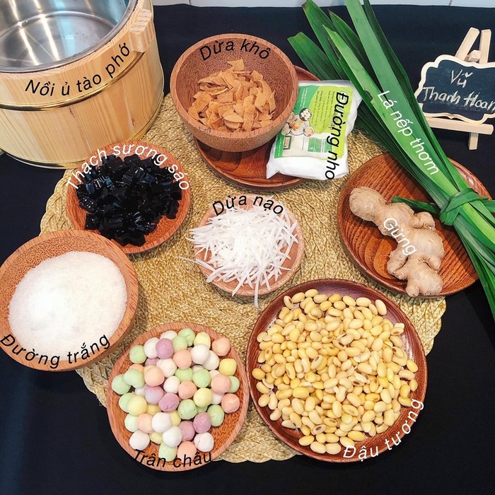 Sau khi tào phớ đông lại, múc ra bát, cho thêm nước đường, trân châu, dừa nạo, thạch, dừa khô.