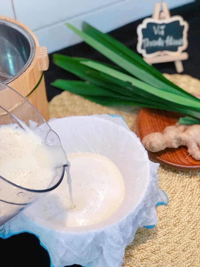 - Cho đậu đã đãi sạch vào máy xay sinh tố với 1 bát con ăn cơm nước để xay. Sau đó, đổ đậu qua 1 cái âu to cùng với 1 lít nước, lọc đậu qua tấm vải xô. Lọc 2-3 lần, lọc càng kỹ thì tào phớ càng mịn.