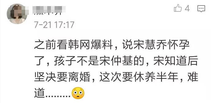 Ý kiến của netizen: "Trước đây, Knet nói rằng Song Hye Kyo mang thai, đứa trẻ không phải là con của Song Joong Ki, Song Joong Ki biết tin liền đòi ly hôn. Nay lại nghỉ nửa năm, có lẽ nào..." như muốn ám chỉ Song Hye Kyo có lẽ đang thật sự trong quá trình mang thai