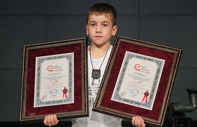 Cậu bé Rahim (6 tuổi, người Chechnya) nhận hai danh hiệu kỷ lục chống đẩy với thành tích 4.183 cái và 4.618 cái. Ảnh: TASS.